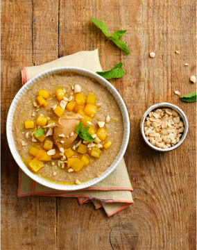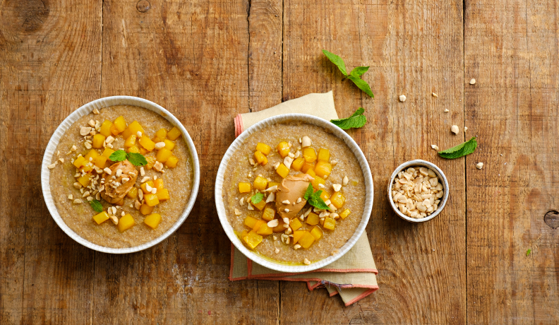 Divide the hot porridge among bowls. Top with the roasted pumpkin and peanut butter, drizzle with amaranth oil, and sprinkle with chopped peanuts.