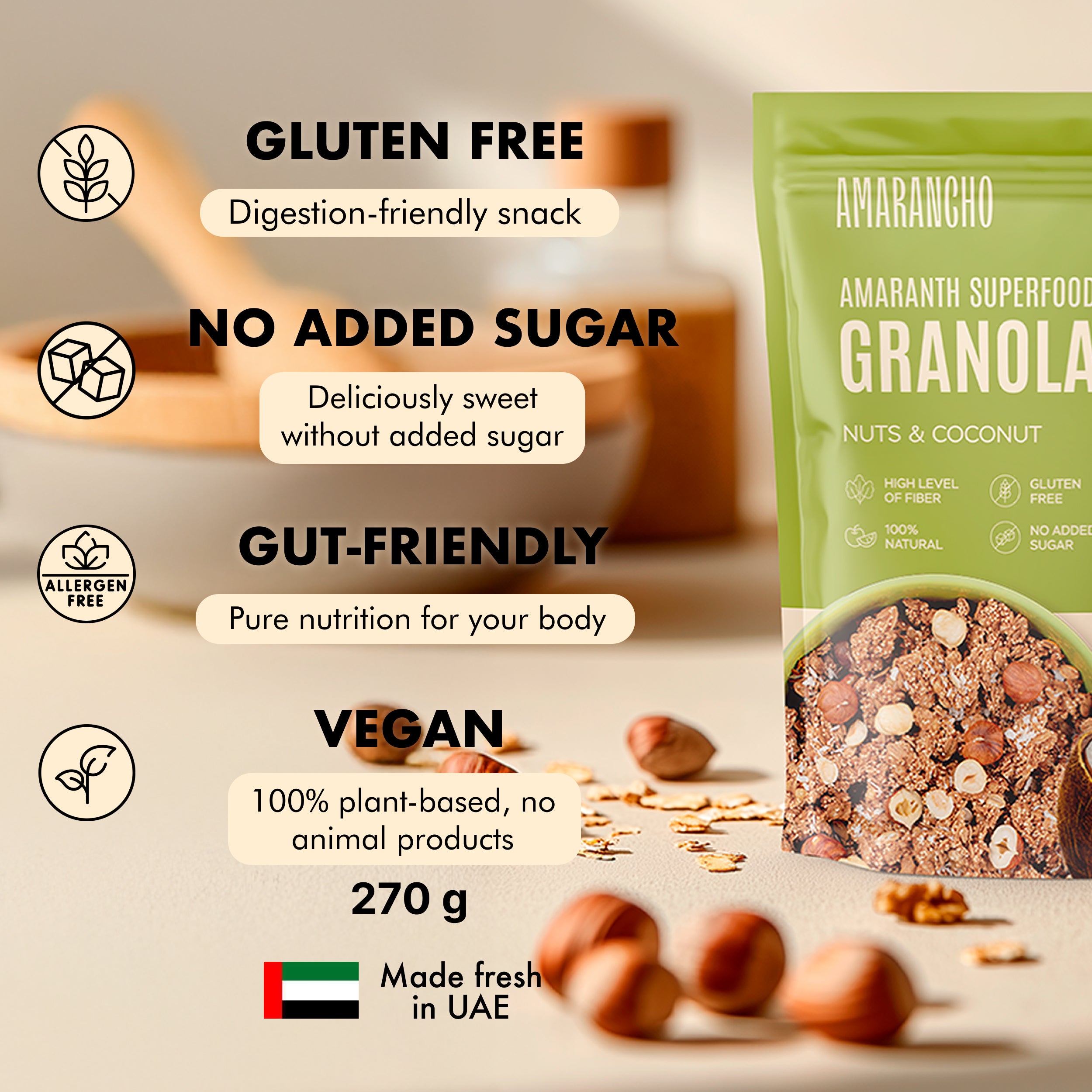 Our Amaranth Oat Granola is a delicious and nutrient-packed blend of ancient superfoods and natural ingredients. Made with crunchy oats, popped amaranth, nuts and coconut flakes, it delivers the perfect balance of taste and nutrition in every bite.