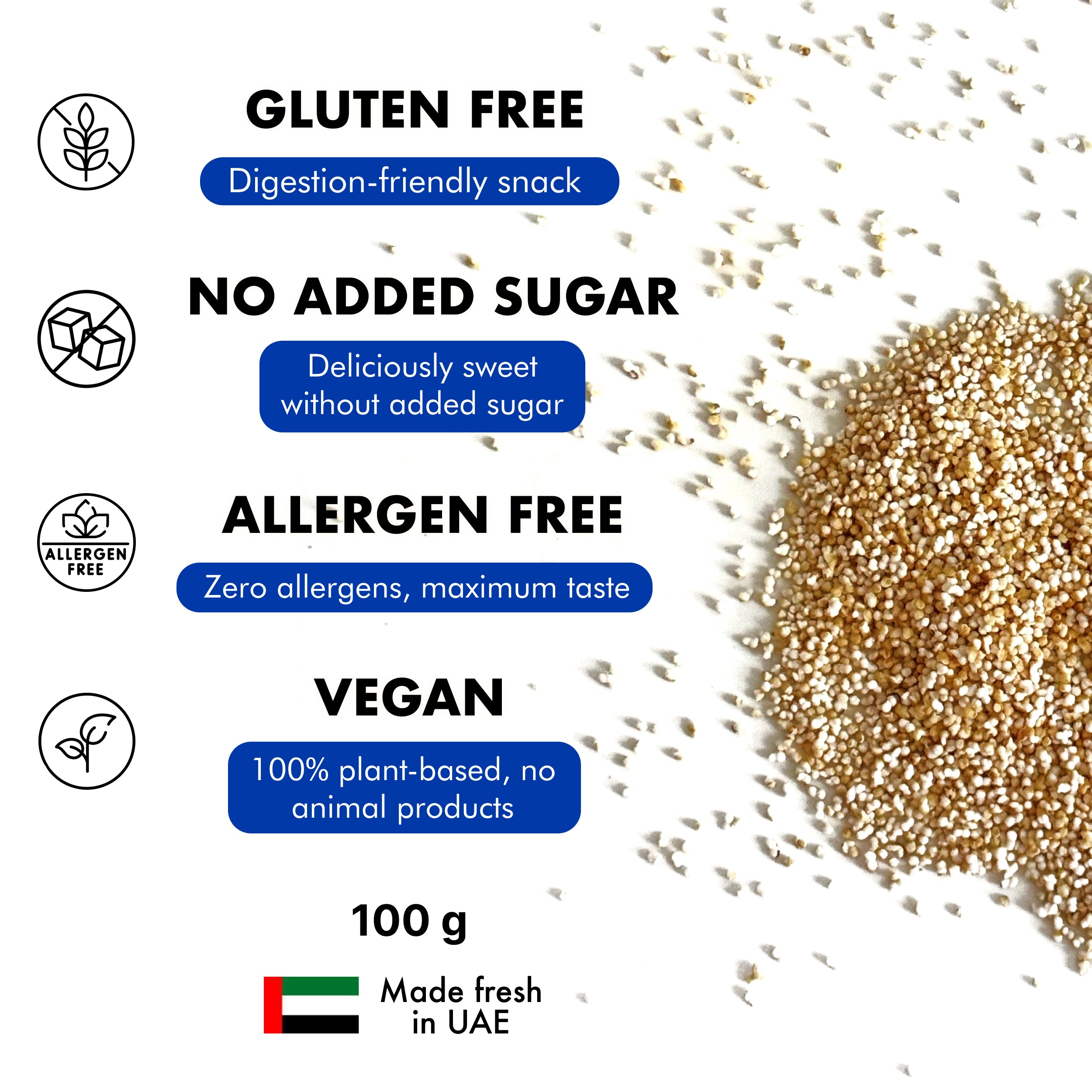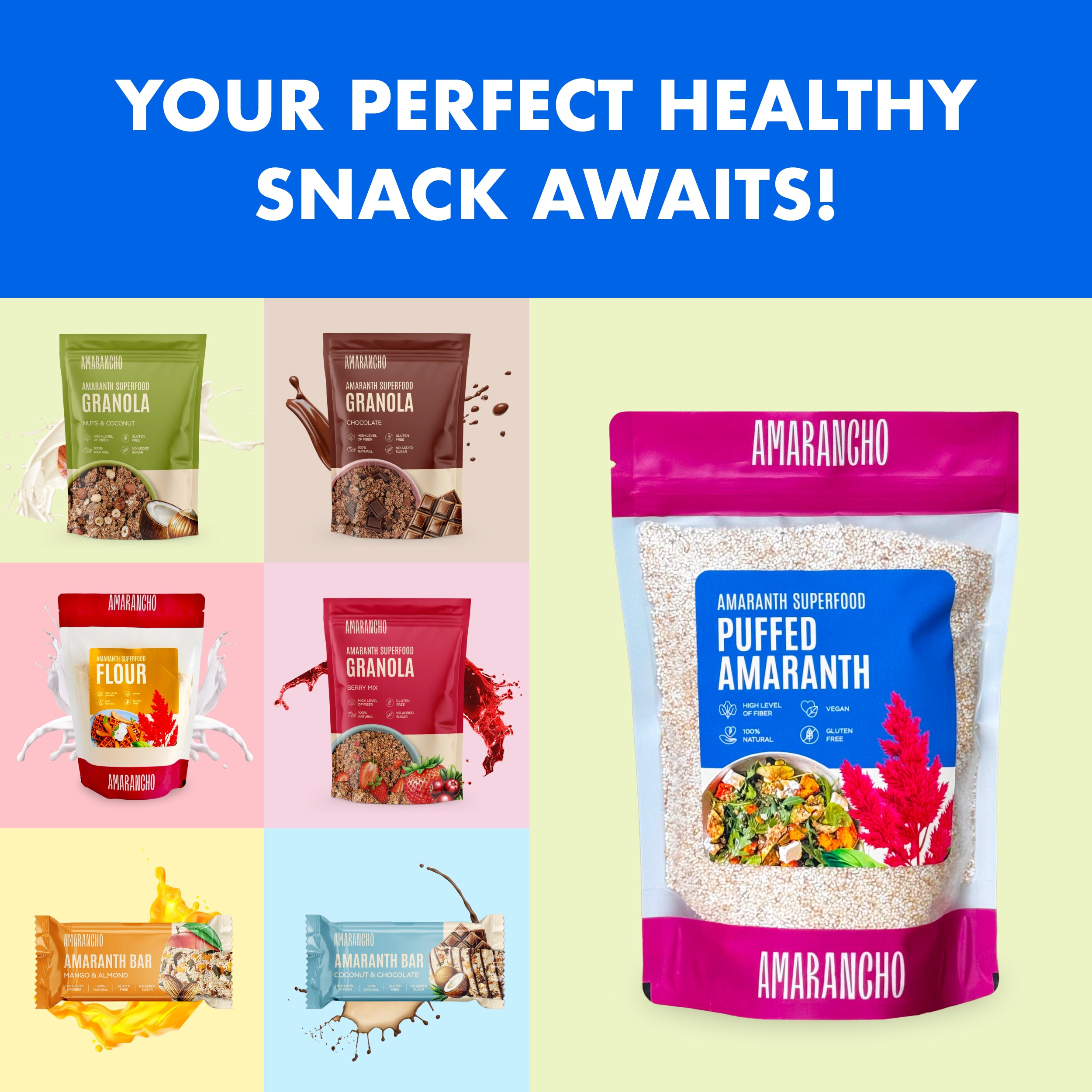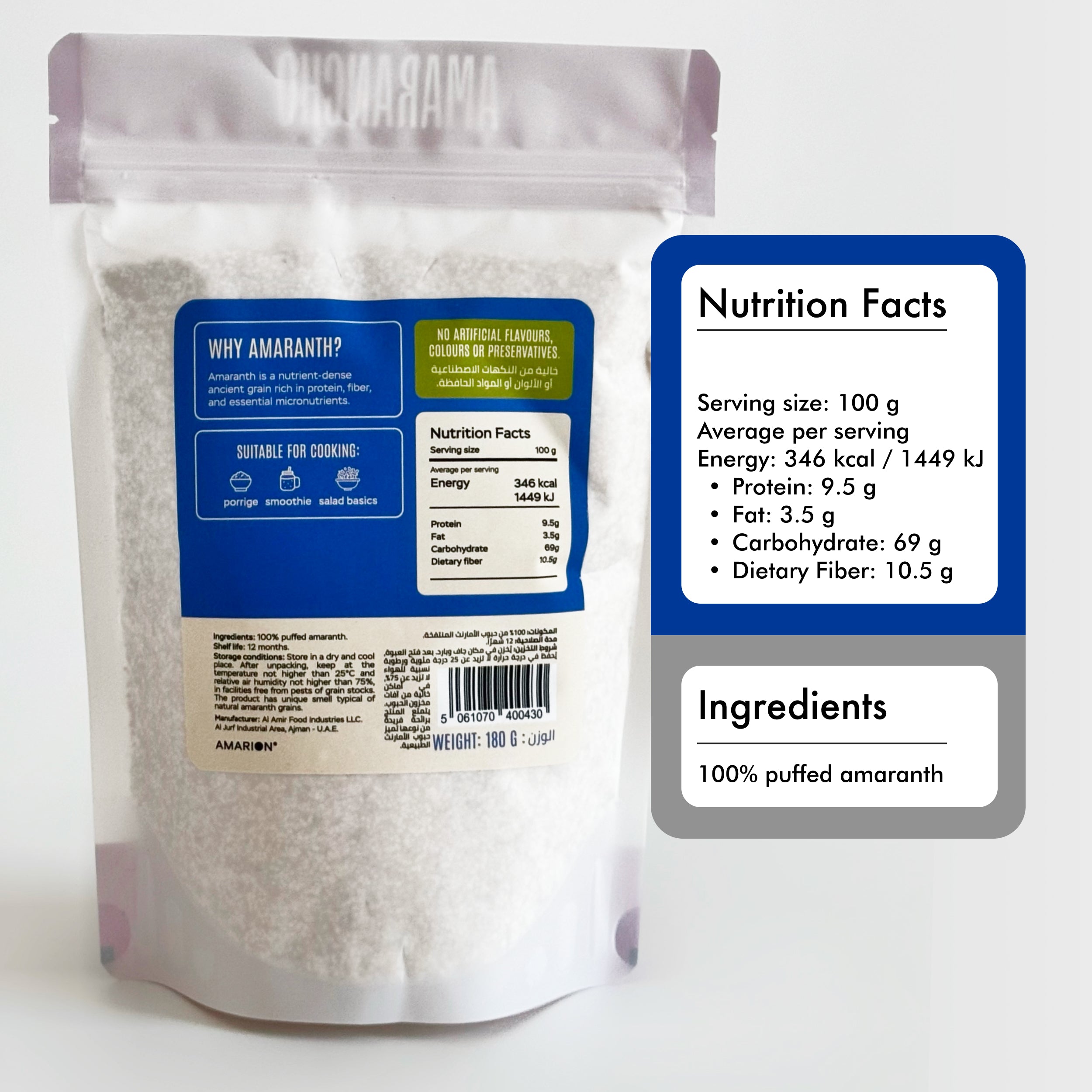Amarancho Puffed Amaranth is a gluten-free, protein-packed superfood with a light and airy texture. Perfect for adding crunch and nutrition to your meals! Enjoy in yogurt, smoothies, baking, porridge or as a topping for salads and cereals. Upgrade your diet with this ancient grain—pure, wholesome, and packed with goodness!